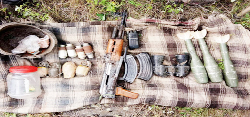 Recoveries made from the hideout included one AK 56 rifle, two AK magazines, 60 rounds, four UBGL grenades, four hand grenades, one wireless set, one Radio set antenna, three RPG rounds, one binocular, cooking utensils and two blankets.