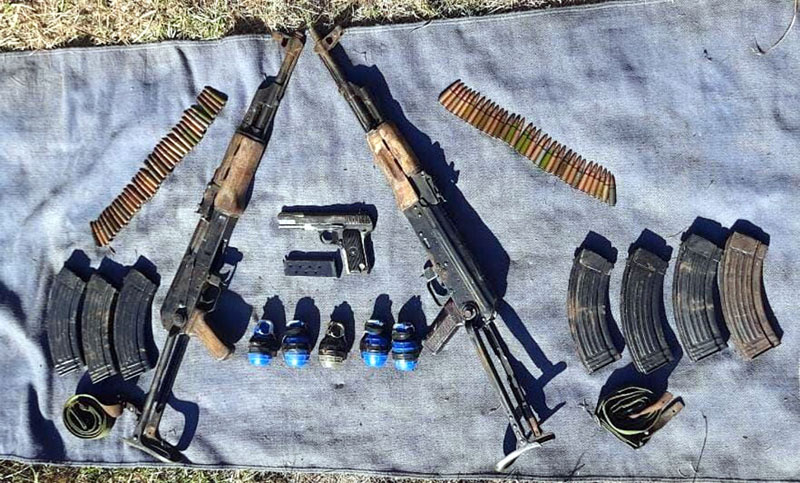 The recoveries made from the hideout included two AK assault rifles, six magazines, 69 rounds, one pistol with a magazine and five hand grenades, an official said.