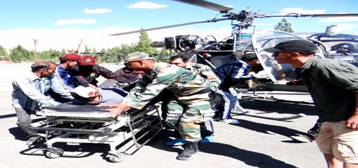 Army and Air Force jawans shifting an injured in a helicopter to airlift him to Leh Hospital.