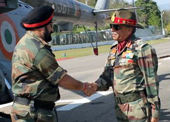 Army chief Gen Bikram Singh being received at the Northern Command Headquarters in Udhampur by GOC-in-C Lt Gen Sanjiv Chachra on Friday.