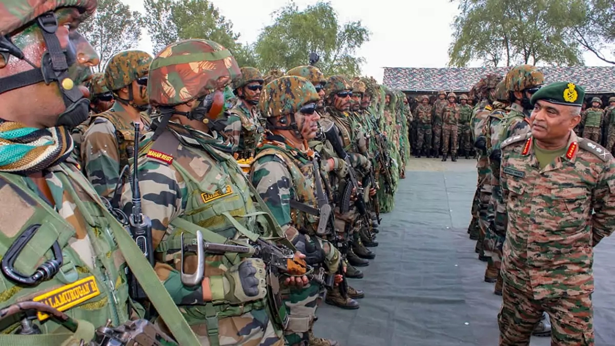 Chief of Army Staff General Manoj Pande interacts with soldiers during a visit to review the forward areas in Rajouri Sector of Jammu and Kashmir.