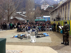 DODA, Feb 28: To prevent an environment of confusion and to carry out coordinated relief and rescue work in coordination with the civil administration and PMF during earthquake a joint disaster management exercise was conducted by the Sohanda Rashtriya Rifles Battalion of Suigarh Rashtriya Rifles of Delta Force at Gundo, district Doda.