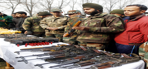Army displaying arms and ammunition recovered from recent encounters at Badami Bagh in Srinagar on Sunday.