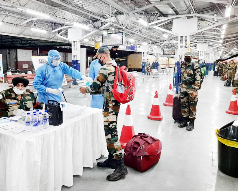 Army jawans being screened on their arrival in a special train at Jammu Tawi Railway Station on Monday.