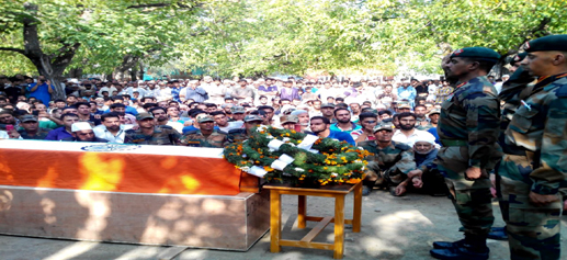 Army jawans pay tributes to jawan Bashir Ahmad War, who was killed in an encounter, at Tanghdar yesterday, at Kupwara on Sunday. -Excelsior/ Aabid Nabi