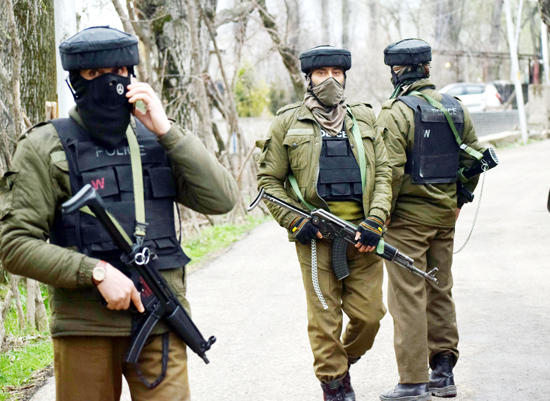Army men take position during encounter at Balhama area on the outskirts of Srinagar on Thursday.     -Excelsior/Shakeel