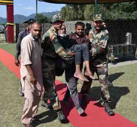 An elderly villager being shifted to Army medical camp by jawans and relatives at Balnoi in Mendhar.