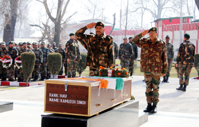 SRINAGAR, Feb 3: Lt Gen AK Bhatt, Corps Commander, Chinar Corps, and all ranks paid homage to three soldiers who were martyred after a snow avalanche swept their post in a forward area near Line of Control (LoC) in Machil sector of frontier district of Kupwara on Friday.