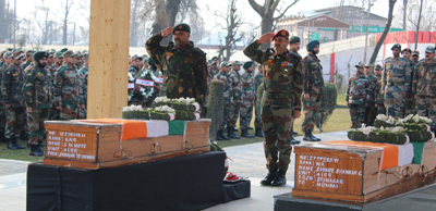 SRINAGAR, Feb 14: In a solemn ceremony here, Army today paid homage to two soldiers who were killed in a fierce gunfight yesterday at Chowkibal area of North Kashmir’s Kupwara district that also saw the killing of five militants.
