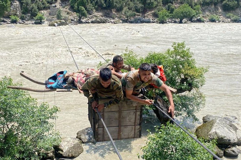 After providing first aid, the Army personnel took him on a cot and crossed the river on a rope with a hanging cart and later evacuated him to the District Hospital Kishtwar, where his condition was stated to be stable.