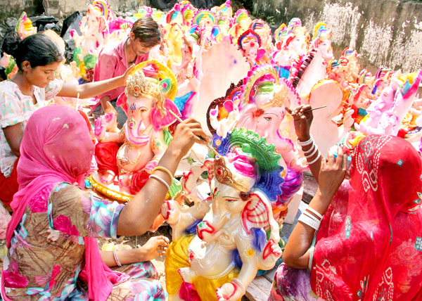Artists giving final touch to Lord Ganesha idols for Ganesh Chaturthi in Jammu. —Excelsior/Rakesh