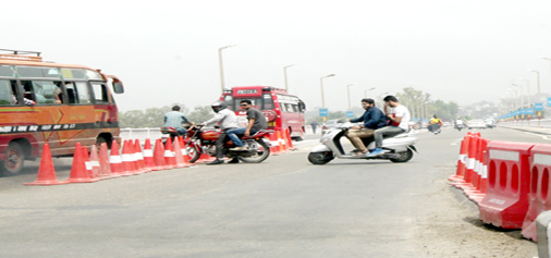 As Bikram Chowk Fly Over has no link to Jewel Chowk, bikers forced to take wrong side to reach their destination, on Monday. -Excelsior/Rakesh