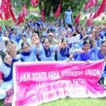 Asha workers from Udhampur, Kathua, Samba, Reasi, Rajouri and Jammu districts, under the banner of Asha Workers Union, affiliated with CITU assembled at Maheshpura Chowk, near Govt Medical College at around 11 am today and then took out a protest rally towards Directorate of Health Services near MLA Hostel.