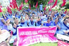 JAMMU, Sept 27: A large number of Asha workers from various districts and tehsils, took out a protest rally and later staged protest demonstration and dharna outside the office of Director Health Services here today.