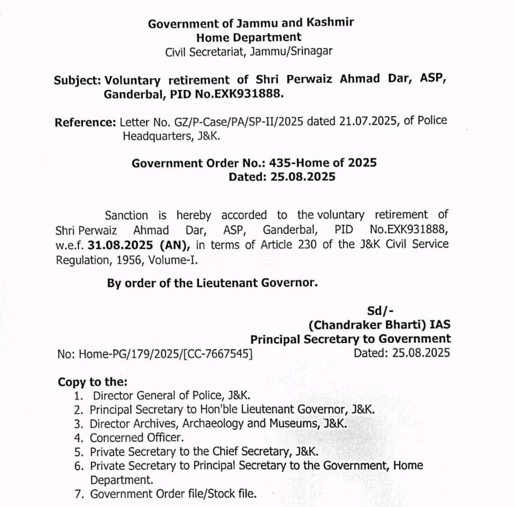 ASP Perwaiz Ahmad Dar Granted Voluntary Retirement By Daily Excelsior - August 25, 2025 Share FacebookTwitterWhatsAppPinterestLinkedinCopy URLTelegramEmailTumblrReddItPrintKoo JAMMU, Aug 25: The Government of Jammu and Kashmir has accorded sanction to the voluntary retirement of Perwaiz Ahmad Dar, Additional Superintendent of Police (ASP) Ganderbal, with effect from August 31, 2025 (AN). Follow our WhatsApp channel