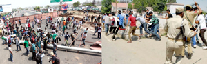 Candidates protesting by blocking Tawi bridge at Jammu on Wednesday (left) and Police using force to disperse youth outside Indoor stadium at Srinagar (right). -Excelsior/Rakesh/Amin War