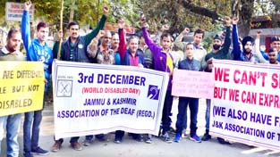 JAMMU, Dec 3: A protest demonstration was held by Jammu and Kashmir Association of the Deaf in the Exhibition Ground near Press Club here, today on the occasion of World Disabled Day.