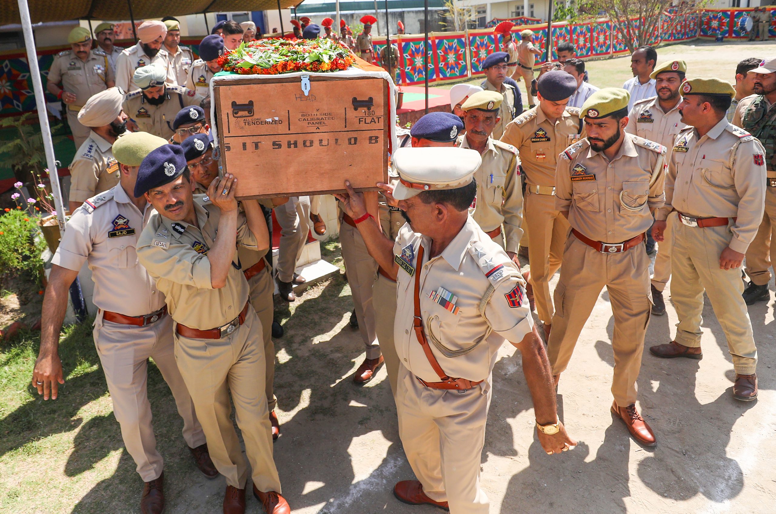 A wreath laying ceremony was held which was attended by parents and wife of the slain officer. Emotional scenes were witnessed as police bid adieu to the officer.