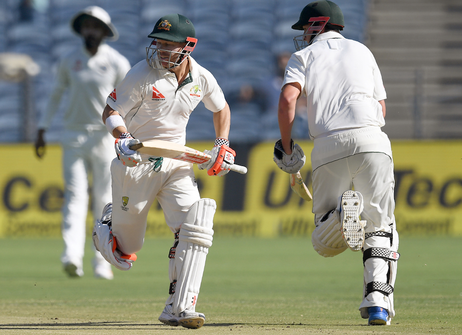 Australia's David Warner (C) and Matthew Renshaw run between the wickets during the first day of the first cricket Test match between India and Australia at The Maharashtra Cricket Association Stadium in Pune on February 23, 2017. ----IMAGE RESTRICTED TO EDITORIAL USE - STRICTLY NO COMMERCIAL USE----- / GETTYOUT / AFP PHOTO / INDRANIL MUKHERJEE / ----IMAGE RESTRICTED TO EDITORIAL USE - STRICTLY NO COMMERCIAL USE----- / GETTYOUT
