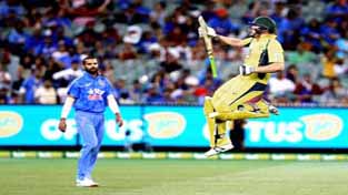 Australia’s James Faulkner celebrates while hitting the winning runs as India’s Shikhar Dhawan (L) watches during their One Day cricket match at the Melbourne Cricket Ground on Sunday.(UNI)