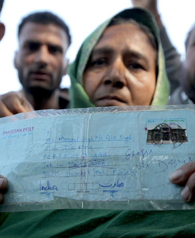 Wife and son of Chamel Singh displaying the letter to reporters...