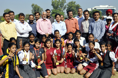 Triumphant Jammu district girls posing for a group photograph alongwith chief...