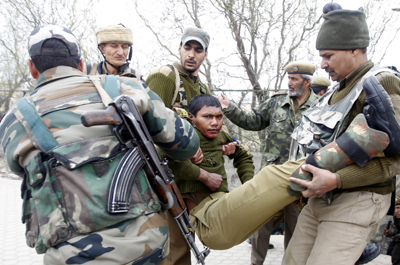 Paramilitary soldiers carry their injured colleague near encounter site at Bemina...