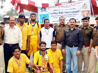 Winners of Police Martyrs Memorial Volleyball and Badminton Tournaments posing for...