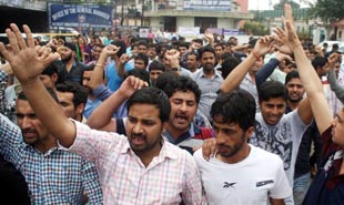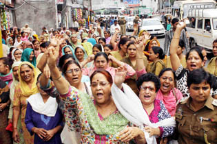 NC workers led by MLA Bimla Luthra protesting outside BJP headquarters...