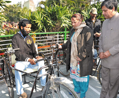 Minister for Social Welfare, Sakina Itoo distributing tricycle to a beneficiary...