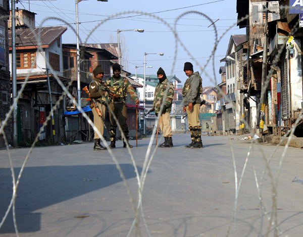 CRPF jawans patrol curfew bound areas in Srinagar on Sunday. -Excelsior/Amin...