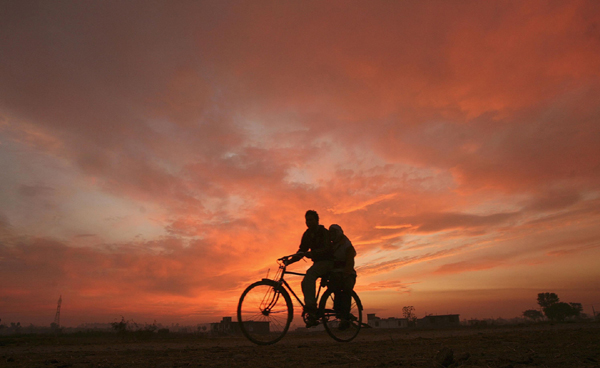 Two people ride a bicycle as the Sun sets on the...