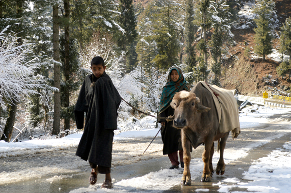 A woman with her son taking a buffalo home from Kokernag...