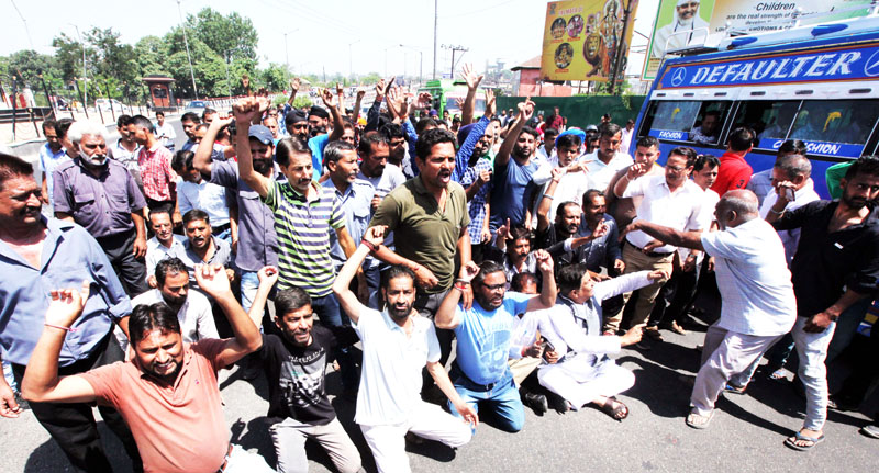 Auto rickshaw drivers raising slogans during protest at Jammu on Frinday. -Excelsior/Rakesh