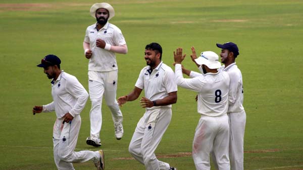 Vidarbha lost wickets at regular intervals from that point and their biggest partnership was a 36 between Atharva Taide (39, 63b, 8×4) and Aman Mokhade (13, 75 balls) for the second wicket.