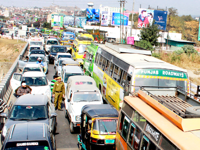 Traffic jam after AWICT’s protests in Jammu. — Excelsior/Raklesh
