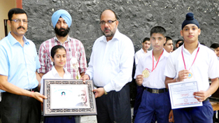 Ayushi holding citation of Sher-i-Kashmir Sports Award and other meritorious sports persons of BSF School Paloura being felicitated in the School premises on Thursday.