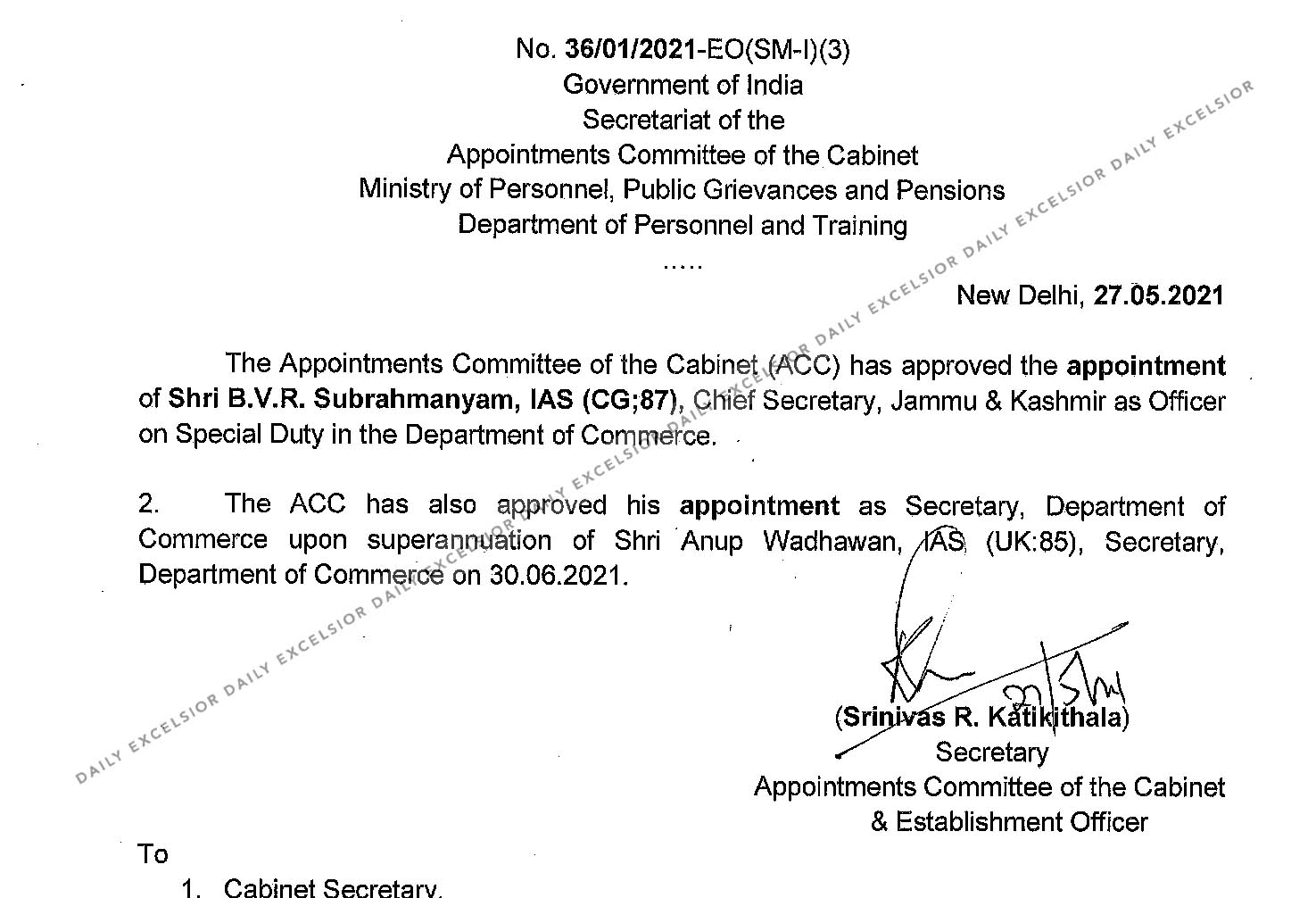 NEW DELHI: Jammu and Kashmir Chief Secretary BVR Subrahmanyam will take over as the new Commerce Secretary, the government said on Thursday, while also granting one-year extension to the heads of the country’s premier intelligence agencies RAW and Intelligence Bureau.