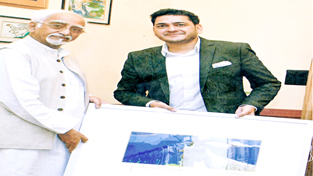 Babar Afzal presenting a painting to Vice President of India Hamid Ansari during a meeting at New Delhi.