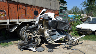 Badly mangled car after collision with truck in Awantipora.