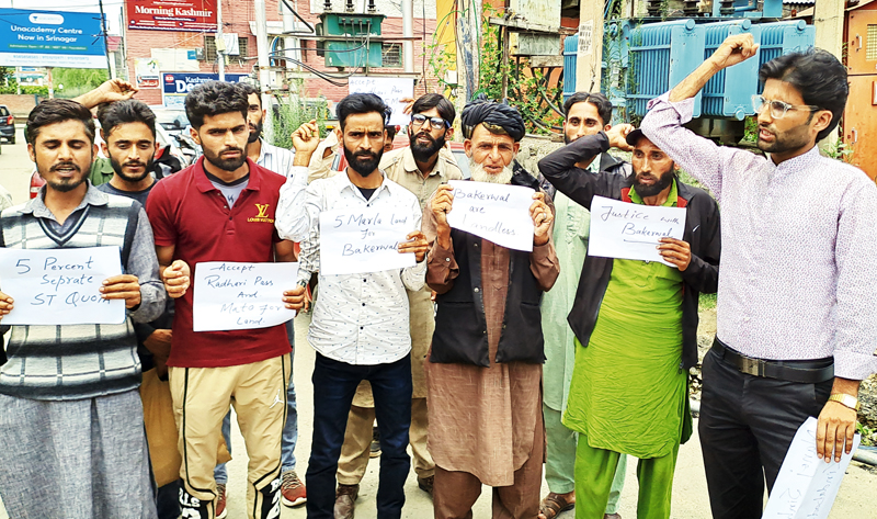 Scores of individuals from the Bakerwal community gathered at the Press Enclave, raising slogans and brandishing placards to emphasize their demands.