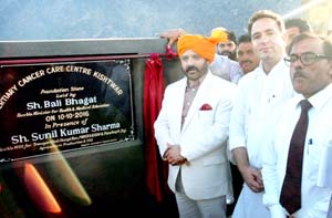 Kishtwar, Oct 10: Minister for Health and Medical Education Bali Bhagat today laid foundation stone of Tertiary Cancer Centre (TCC) at Hargaddi Matta here.