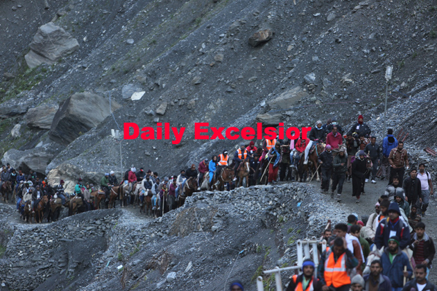 BALTAL : Hindu pilgrims as the walk along mountain trail during her prilgrimage to the sacral Amarnath Holy cave during the first batch to their religious journey to the Amarnath cave via the Baltal route, some 120 kilometers southeast of Srinagar, on Thursday. Hindus believe the cave to be an abode of the god Shiva. The 44-day annual Amarnath yatra (pilgrimage) started from 2 July 2015.Excelsior /Mohd Amin War