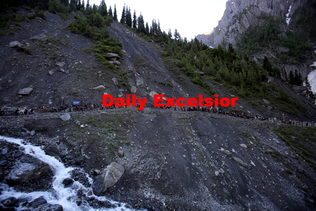July-04, 2015-BALTAL: Hindu pilgrims Cross Mountain trails during their religious journey to the Amarnath cave shrine on the Baltal route, some 125 kilometers northeast of Srinagar, Jammu and Kashmir, on Saturday. Hindus believe the cave to be an abode of the god Shiva. The 59-day annual Amarnath yatra pilgrimage. Photo/Mohd Amin War