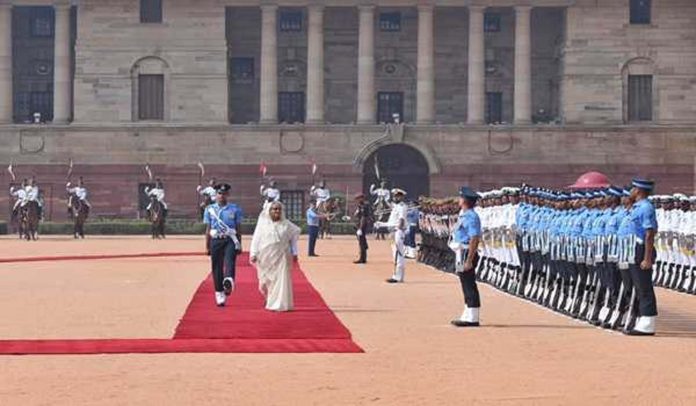 New Delhi, June 22:  Bangladesh Prime Minister Sheikh Hasina was on Saturday morning accorded a ceremonial welcome at the forecourt of Rashtrapati Bhavan, ahead of holding bilateral talks with Prime Minister Narendra Modi.