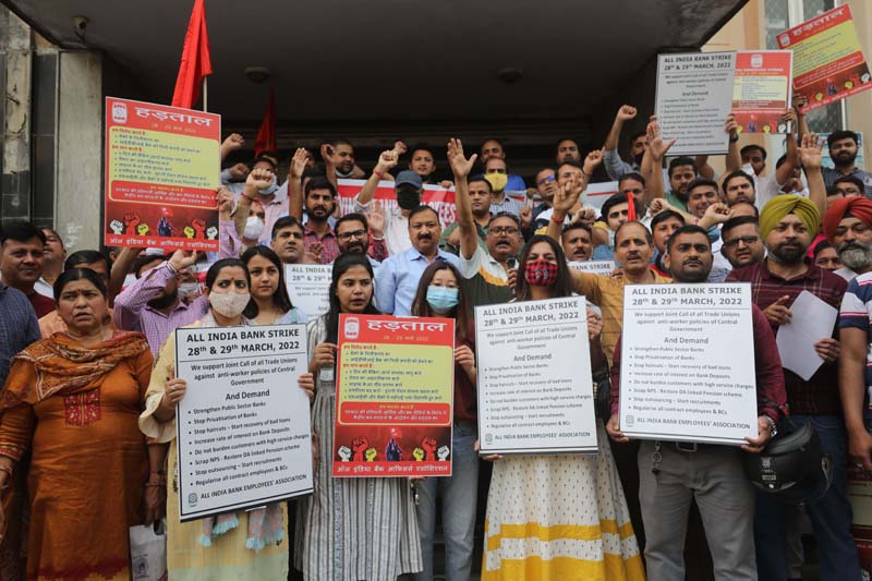 The protest was part of the series of protest programs against anti-labour policies of Government of India including the strikes on 28th and 29th March. The demonstration was addressed by Arun Kumar Gupta, general secretary, Jammu Province Bank Employees Federation.