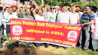 Bank employees raising slogans during protest at Jammu on Tuesday.