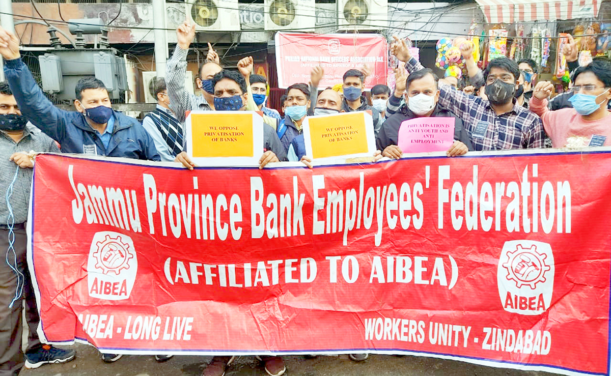 Bank employees staging protest in Jammu on Friday. By Daily Excelsior - March 12, 2021 Share FacebookTwitterWhatsAppPinterestLinkedinCopy URLTelegramEmailTumblrReddItPrintKoo Bank employees staging protest in Jammu on Friday. Bank employees staging protest in Jammu on Friday. Follow our WhatsApp channel