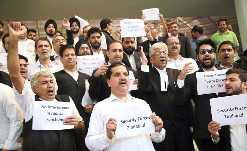 JAMMU, Sept 14: J&K High Court Bar Association, Jammu held a protest demonstration at the District Court Complex here over hike in prices of petrol, diesel and other essential commodities, recent militants attack at Jhajjar Kotli and organized attack by some political parties on the independent functioning of the judiciary by protesting in streets against the case which is pending in the Supreme Court.
