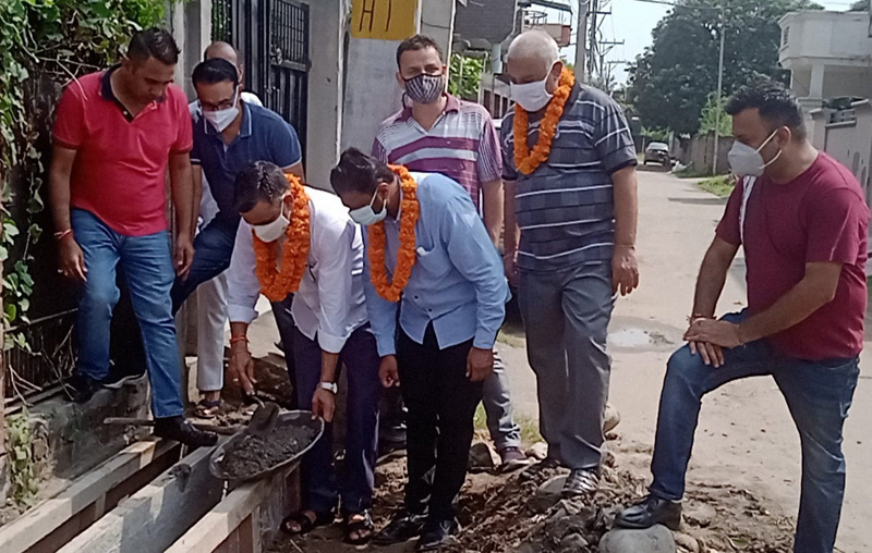 Jammu, Aug 28: Continuing efforts on providing a clean and virtuous ambience to the residents of Ward-41, Senior Bhartiya Janta Party (BJP) Leader and JMC Councillor Sanjay Kumar Baru along with Mandal President Keshav Chopra, Jatin Sethi and Ward President Ashok Wazir started the construction work of first drain at KC Hazuri Bagh Bohri.
